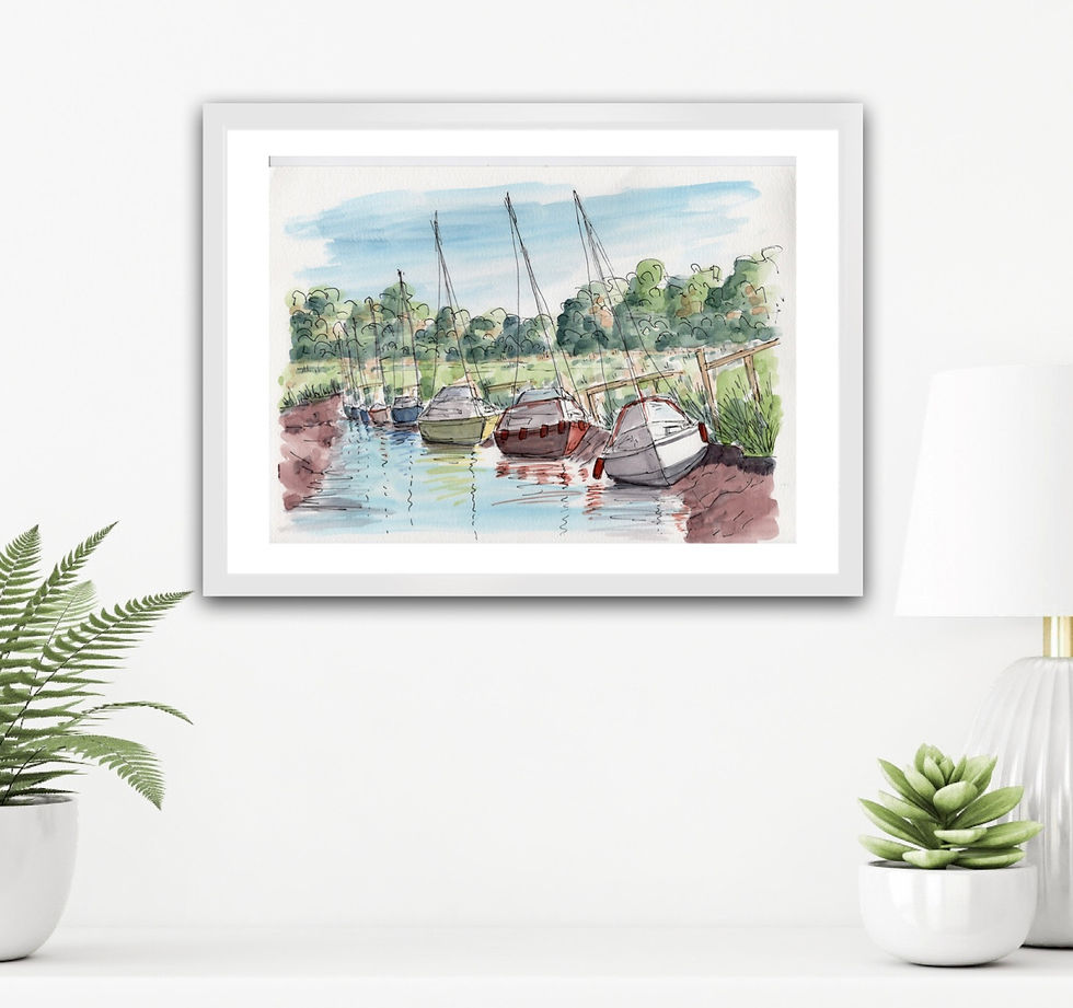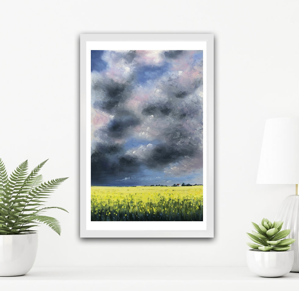 Most paintings are available unframed or framed, with a choice of frame and mount colour. Simply select framing options from the drop down menu.